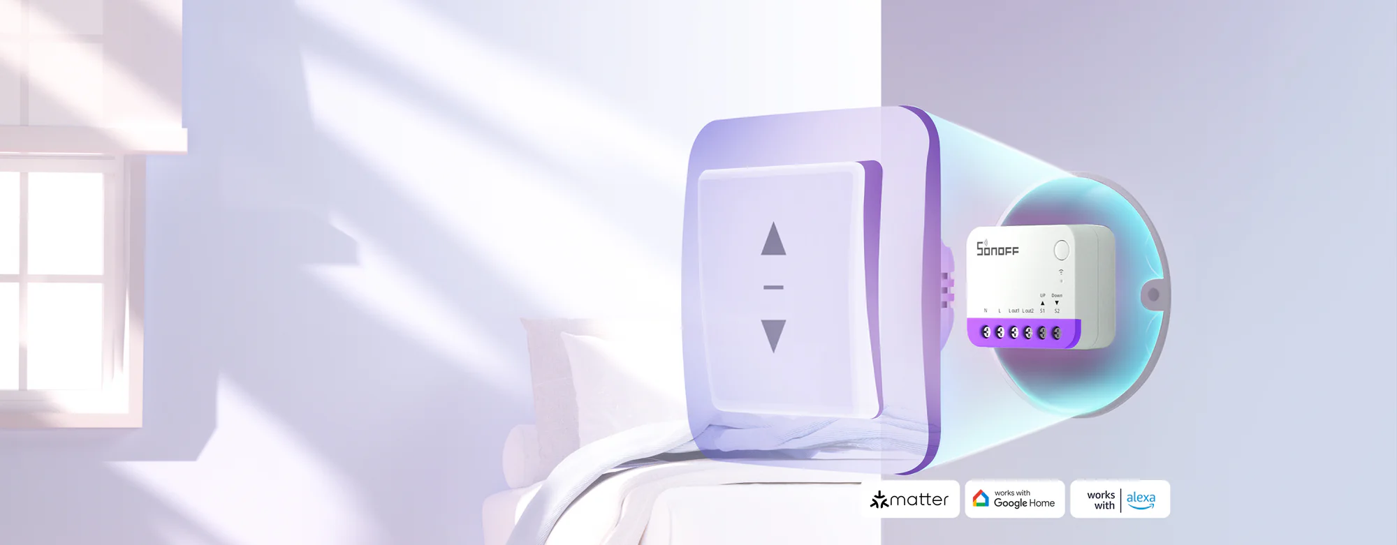 Цей контролер легко інтегрується безпосередньо в мотор твоїх ролетів, а ще чудово працює з зовнішнім настінним вимикачем у підрозетнику. Тобто ти отримуєш подвійний профіт: керуй шторами як через Apple Home чи голос, так і звичним натисканням кнопки.
